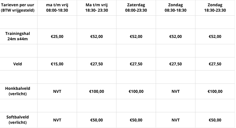 Onderstaande tarieven zijn van toepassing voor onderwijs, sport en cultuur gerelateerde activiteiten. Voor andere activiteiten geldt een toeslag van 50%. Bij huur van een veld kan in verband met heel slecht weer last minute worden uitgeweken naar de hal (mits deze beschikbaar is). Het hoogste tarief is dan van toepassing. Zo’n last minute wijziging 15 min tevoren melden via een whatsapp bericht aan onze accommodatie beheerder.