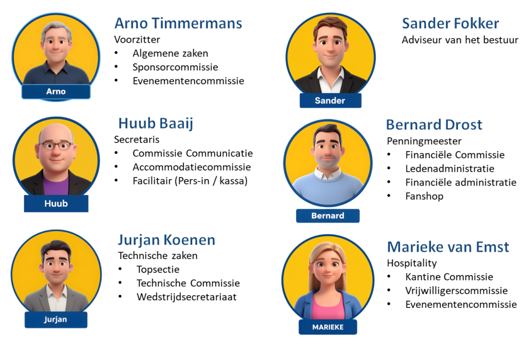 Het dagelijks bestuur van HCAW wordt gevormd door de voorzitter, secretaris en penningmeester. In de afbeelding zie je ook welke commissies onder welke bestuursdiscipline vallen.